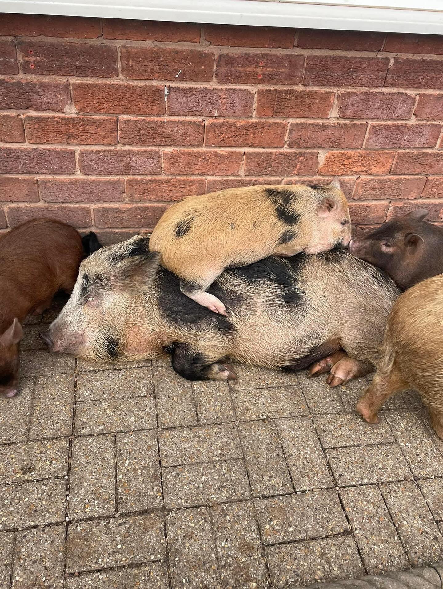 We found Tiny Tim in 2020, confined to a dog crate in someone's home. This neglect caused his trotters to deform, and he suffered from Mange, a condition that took over six months of medicated baths and injections to clear up. Today, he's now an extremely happy pig, living happily with his own piggy family. Pumpkin, another one of our pigs, is his piggy wife, and together they have 36 piglets! Two of these piglets we still have, including Trousers and Polly Pocket. 🐷