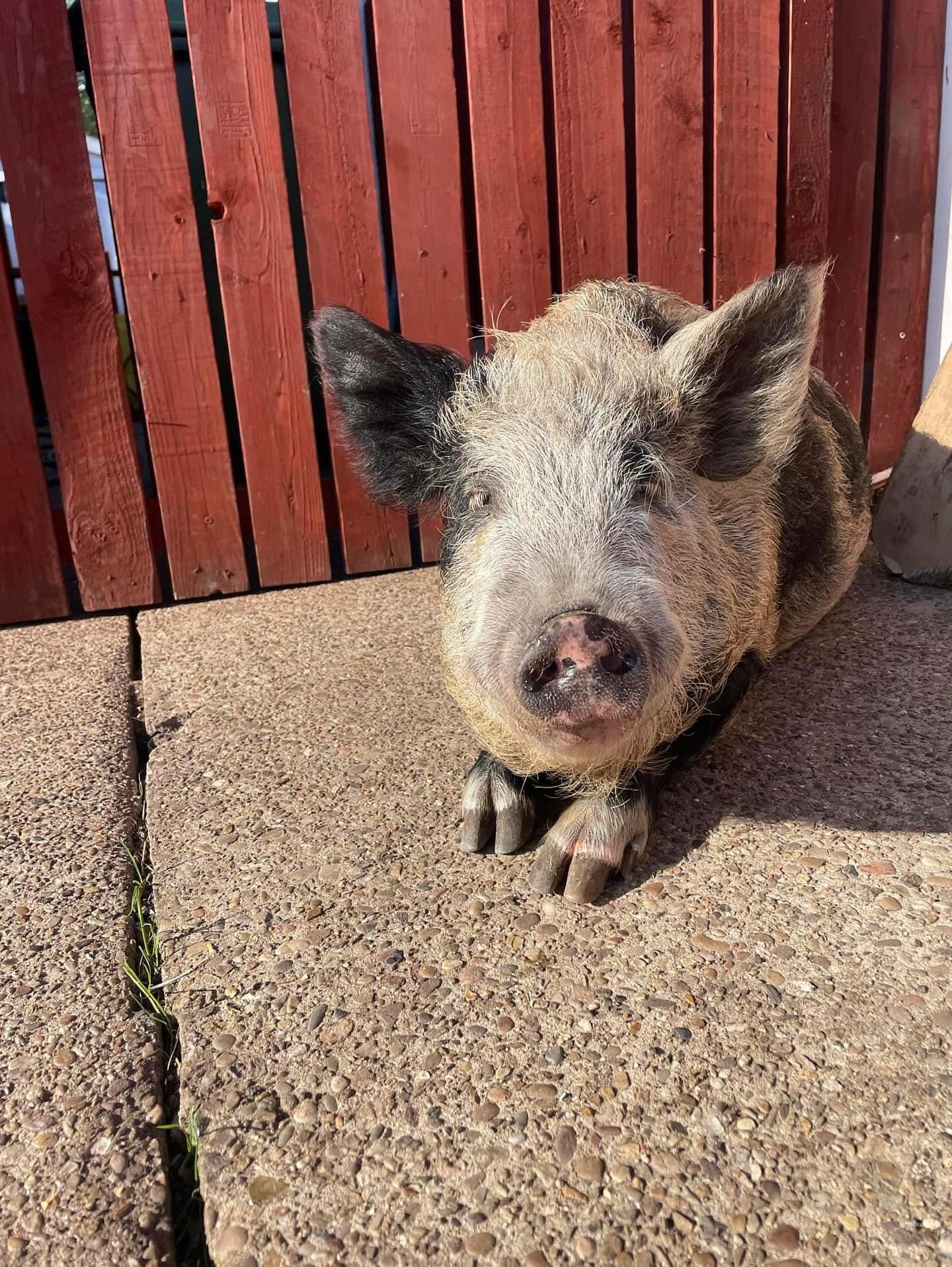 We rescued Pumpkin from a place overcrowded with other neglected pigs. She lived in her own filth without bedding, shelter, or clean water for the first five months of her life, with minimal human interaction. It took nearly a year of care and attention to bring her to where she is today. Originally thought to be a Juliana miniature pig, we suspect she has wild boar lineage, as there was a wild boar on the farm she was rescued from. Since then, she has mothered four beautiful litters of piglets with daddy Tim, and now she enjoys fresh walks and bathing in her pool. She is also the proud mother of Trousers, her eldest son, and her daughter, Polly Pocket. 🥰